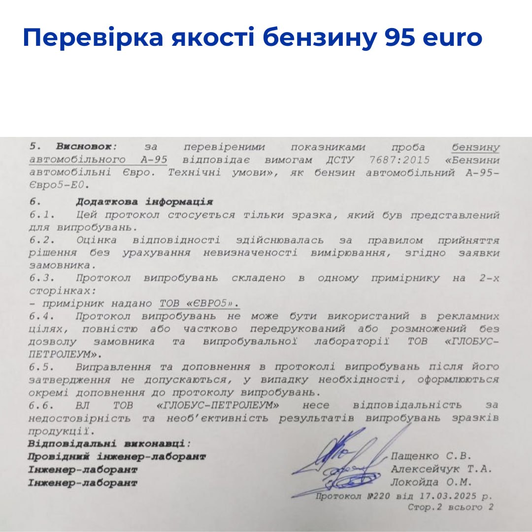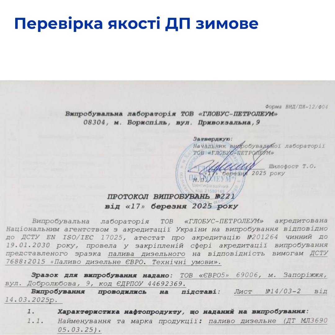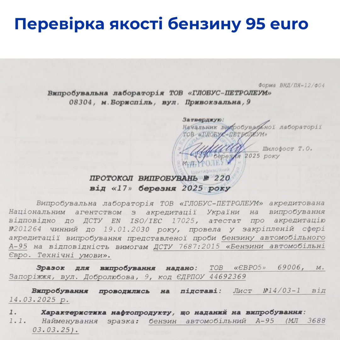 Крупнейшая сеть АЗС Запорожья EURO 5 обнародовала протоколы испытаний дизельного топлива зимнего и бензина А-95 от 17 марта 2025 года.