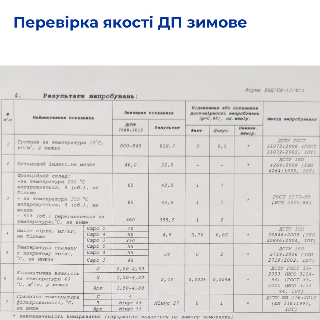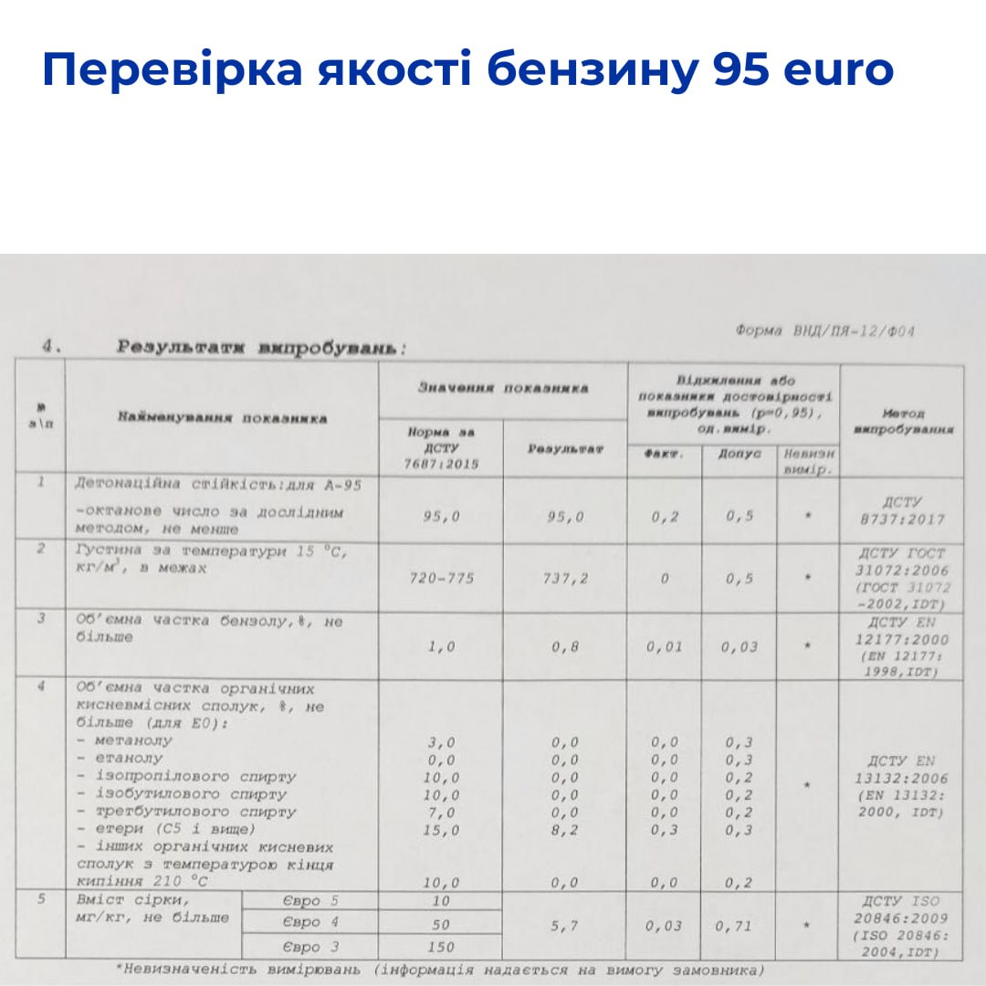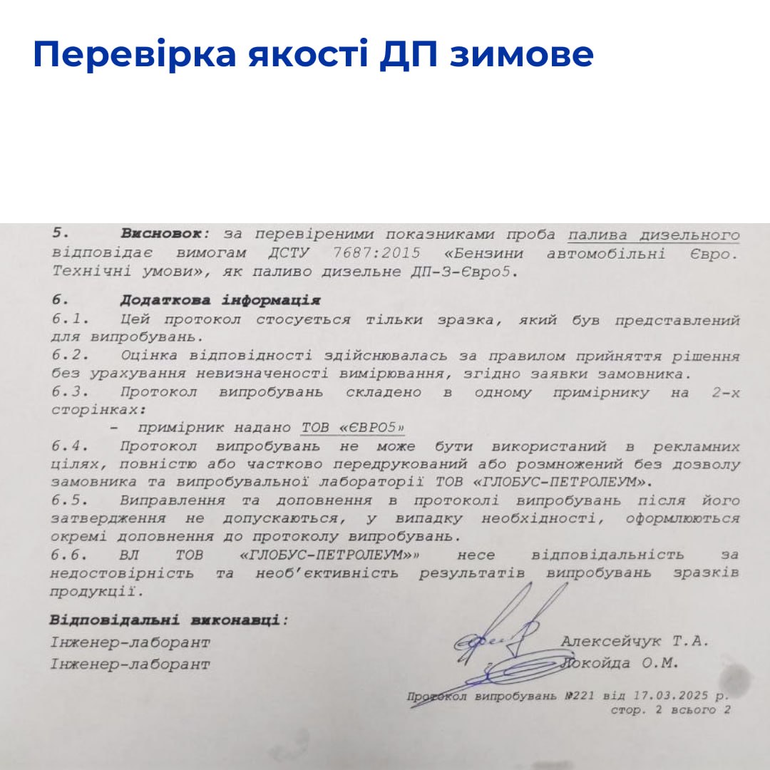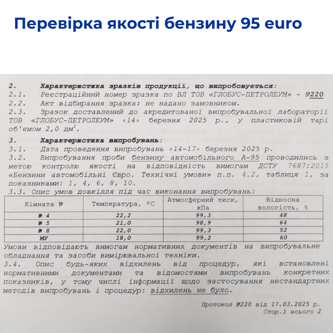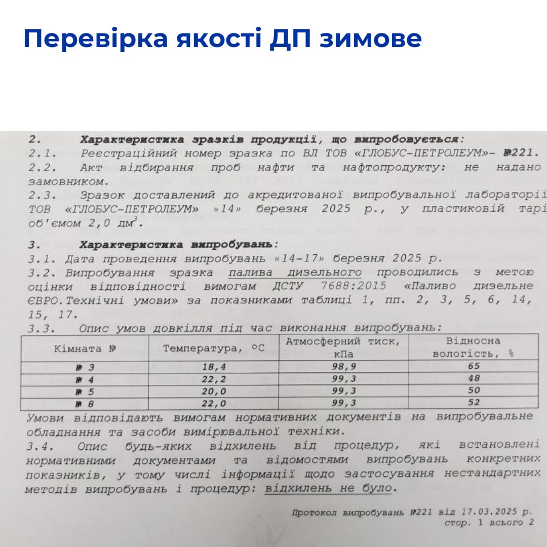 Исследования проводила испытательная лаборатория ООО «Глобус-Петролеум», аккредитованная Национальным агентством по аккредитации Украины на испытания в соответствии с ДСТУ EN ISO/IEC 17025 (аттестат об аккредитации №201264 действителен до 19.01.2030).