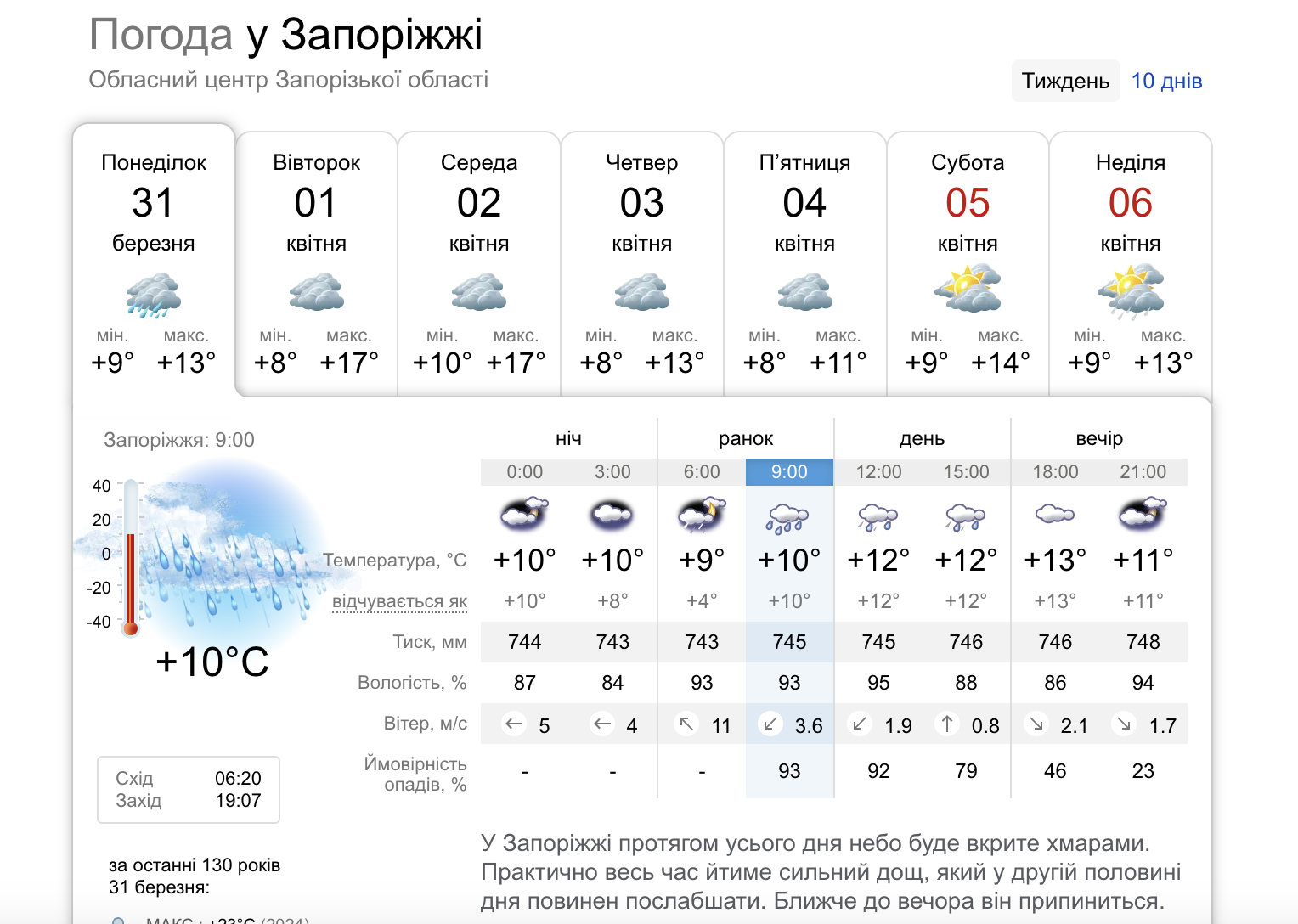 В Запорожье 31 марта проходит дождливый день, но уже с 1 апреля погода улучшится. По прогнозам синоптиков, интенсивные осадки, которые будут идти в течение всего понедельника, ближе к вечеру постепенно прекратятся. Температура в этот день будет колебаться от 9°C до 13°C, а ветер утром усилится до 11 м/с, после чего утихнет.