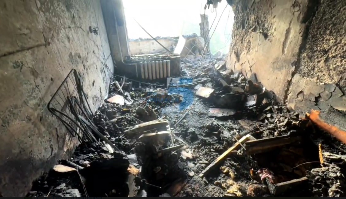 На видео видно, как вещи в комнате полностью выгорели, также нет одной стены, которая выходит на улицу.