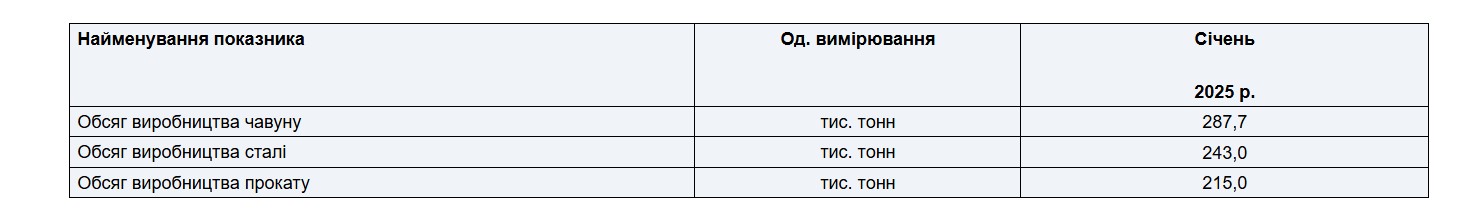 В январе 2025 года на Запорожстали произведено 287,7 тыс. т чугуна, 243,0 тыс. т стали, отгружено 215,0 тыс. т проката.