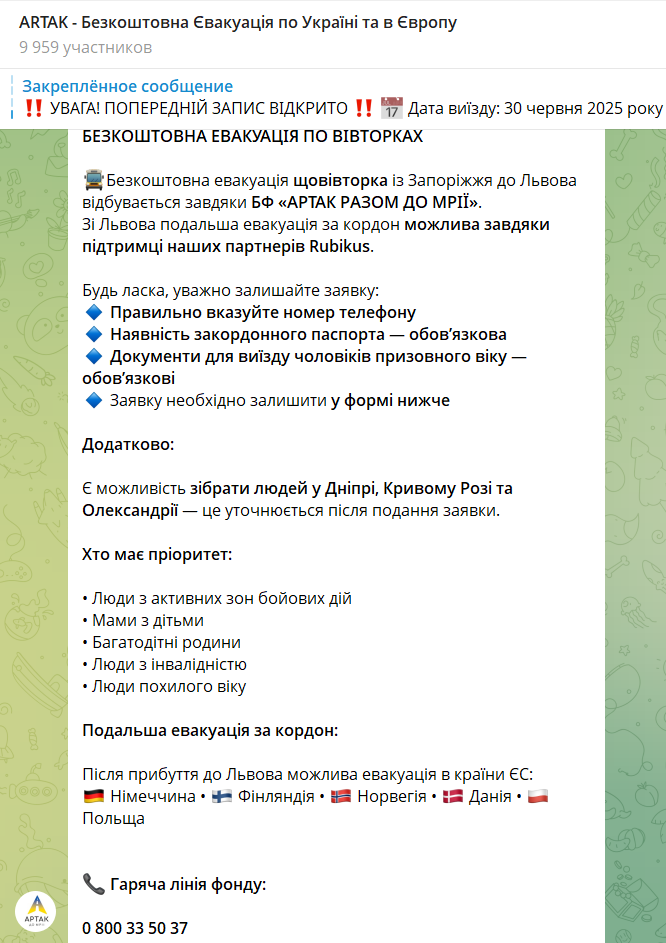 Каждый вторник фонд «АРТАК ВМЕСТЕ К МЕЧТЕ» организует бесплатную эвакуацию из Запорожья во Львов. По прибытии во Львов возможна дальнейшая эвакуация за границу благодаря партнерам фонда Rubikus.