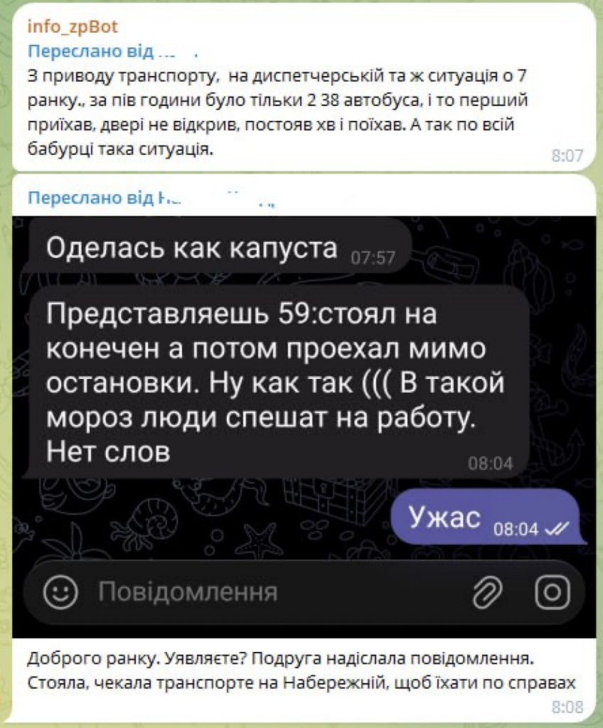 По словам жителей Запорожья, утром практически невозможно доехать из отдельных районов города. В частности, жители сообщают, что с Правого берега добраться на Левый берег практически невозможно: часть маршрутов не работает, другие — переполнены или просто не приезжают.