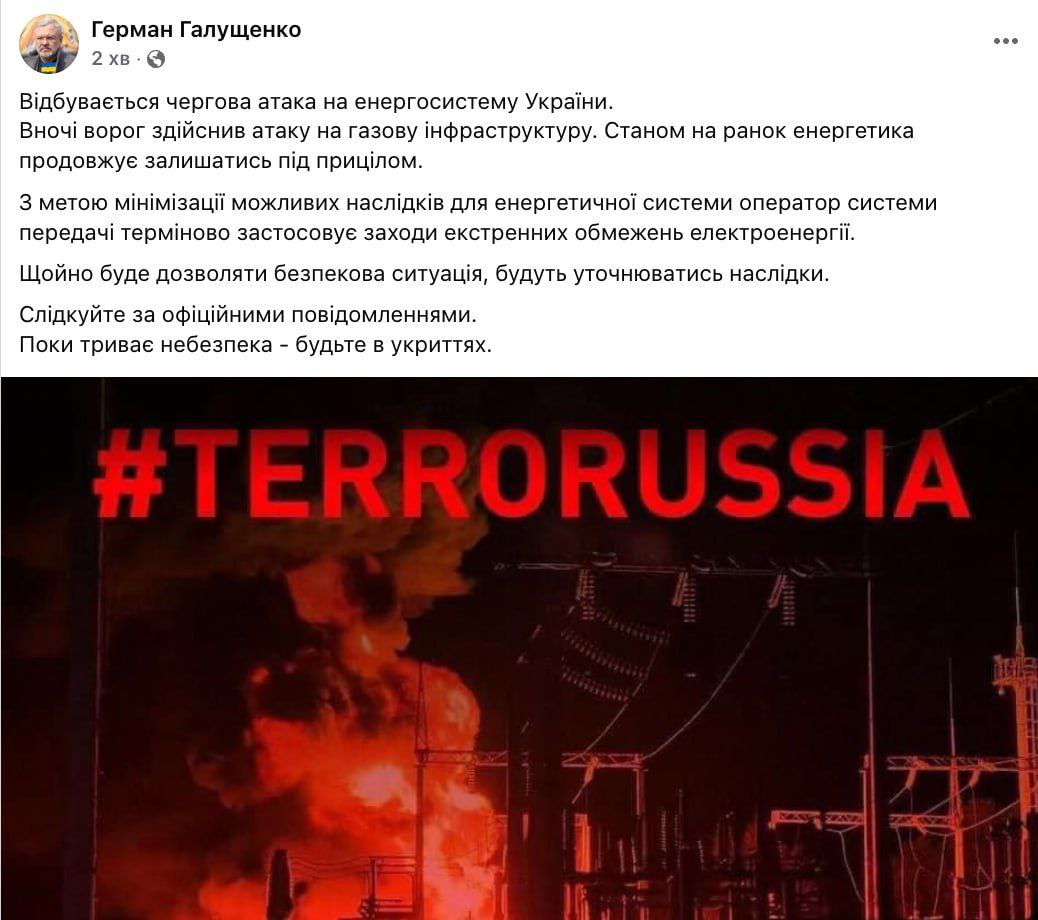 В свою очередь министр энергетики Герман Галущенко сообщил, что под ударом находится газовый сектор страны.