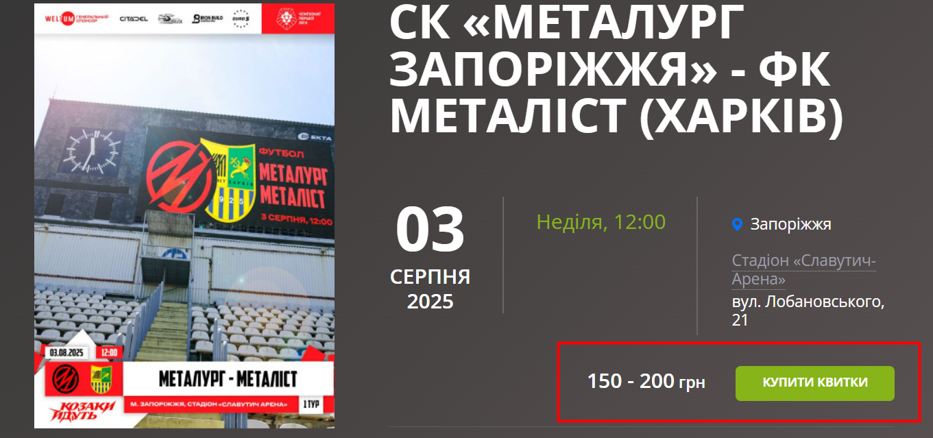 Сейчас уже стартовала продажа билетов на матч «Металлург» — «Металлист». Билеты продаются только на секторы 3, 4 и 5. Стоимость составляет от 150 до 200 грн.