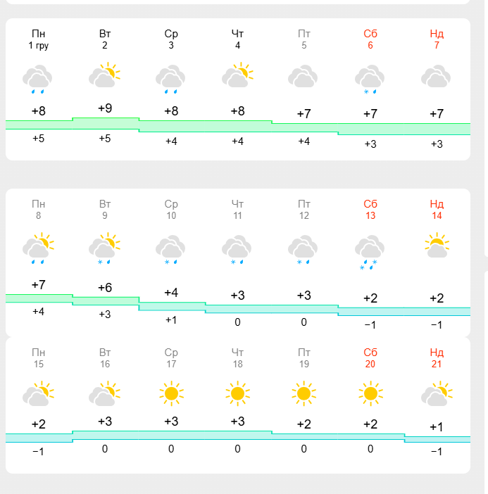 По прогнозам сайтов-синоптиков, ближе к середине декабря в Запорожье возможны осадки в виде снега. Значительная «минусовая» температура ожидается только в конце месяца, ближе к январю. В общем, температура будет держаться на уровне 5 … 7 градусов Цельсия днем.
