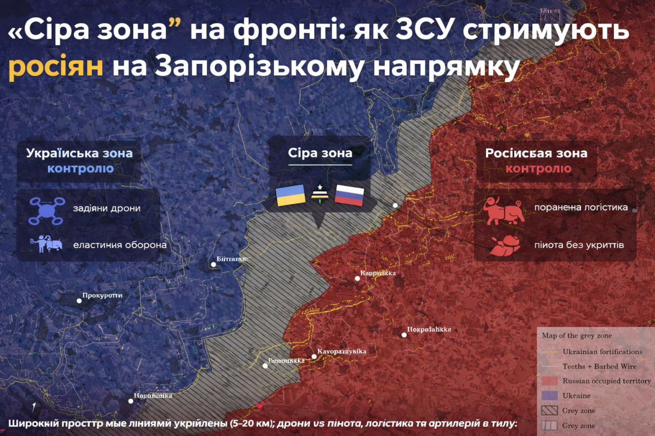 Между украинскими и российскими позициями на фронте существует не просто линия соприкосновения, а широкая «серая зона» глубиной до 20 километров. Именно она все больше определяет ход боевых действий, в частности на Запорожском направлении, где украинские силы выстроили глубокую, гибкую систему контроля территории.
