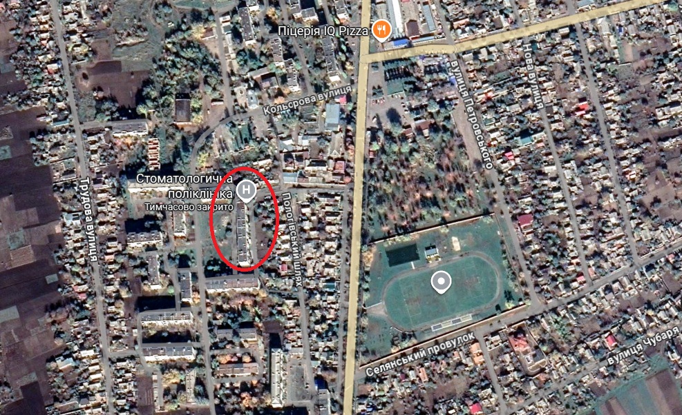 Акцент сделан на геолокации удара — многоэтажки в центре города недалеко от городского стадиона.