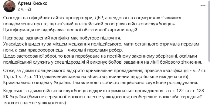 Кроме того, по словам Кисько, по факту действий военнослужащих также открыты уголовные производства по ст. 122 и ст. 128 УК Украины (Умышленное средней тяжести телесное повреждение; неосторожное тяжкое или средней тяжести телесное повреждение).