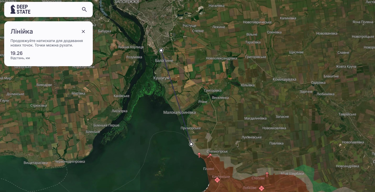 Ймовірно, відстань може бути ще меншою, адже за оцінкою DeepState росіяни також просувалися висохшим дном та парослями Каховського водосховища вже до зупинки електропоїздів «Царкут» (1130 км).