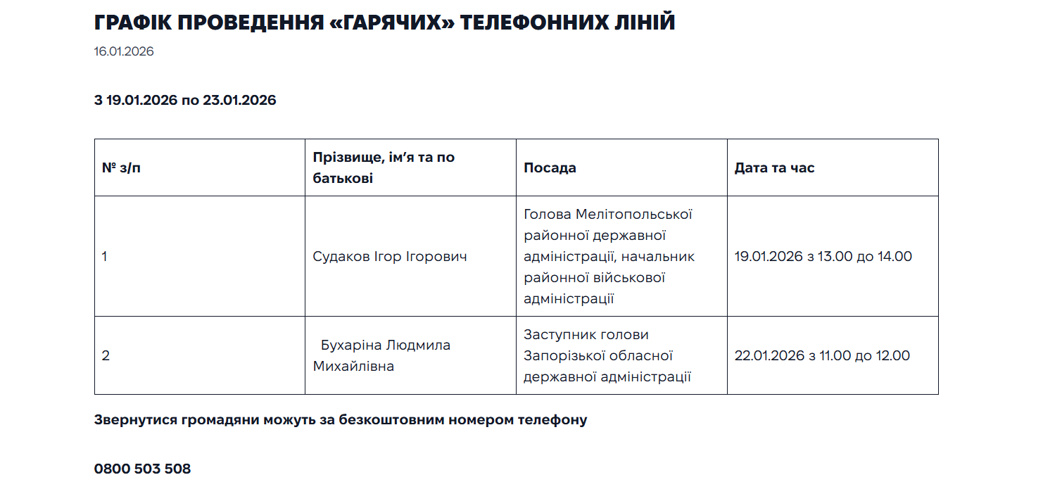 Обычно такие «горячие телефонные линии» проводятся с представителями Запорожской районной администрации по предварительно обнародованным датам и времени, включая возможность задать вопросы по жилищно-коммунальному хозяйству, социальной защите, документальным процедурам и другим сферам, которые волнуют население.