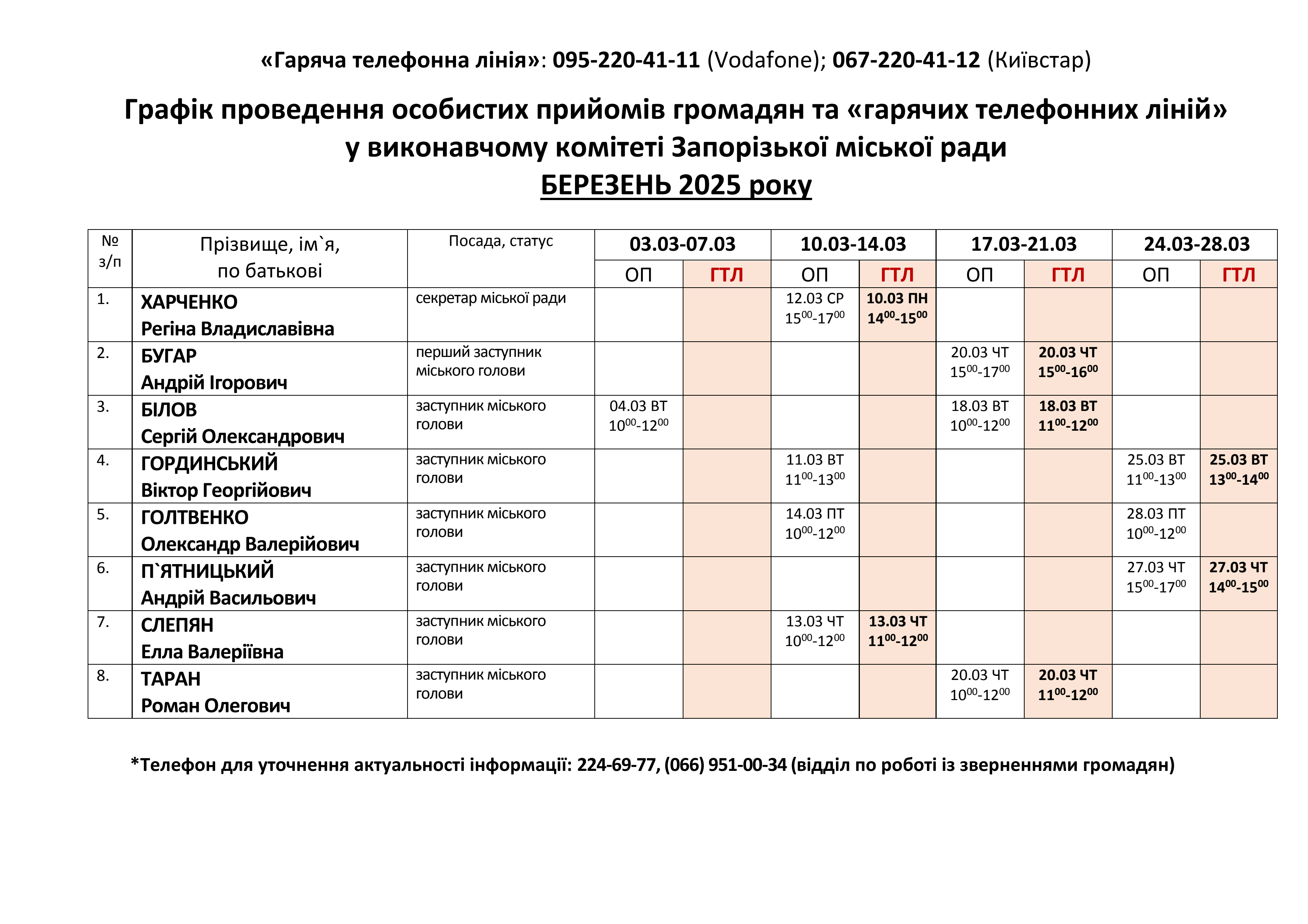 На март в Запорожском городском совете запланировано проведение личных приемов, «горячих» телефонных линий с участием секретаря городского совета, заместителей городского головы.