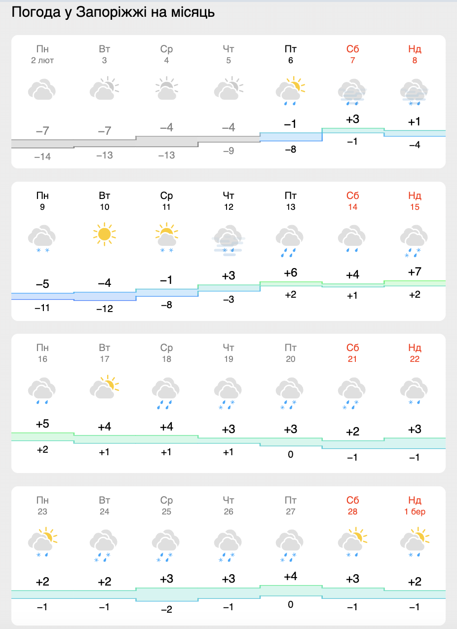 Подробный прогноз погоды в Запорожье на февраль 2026 года