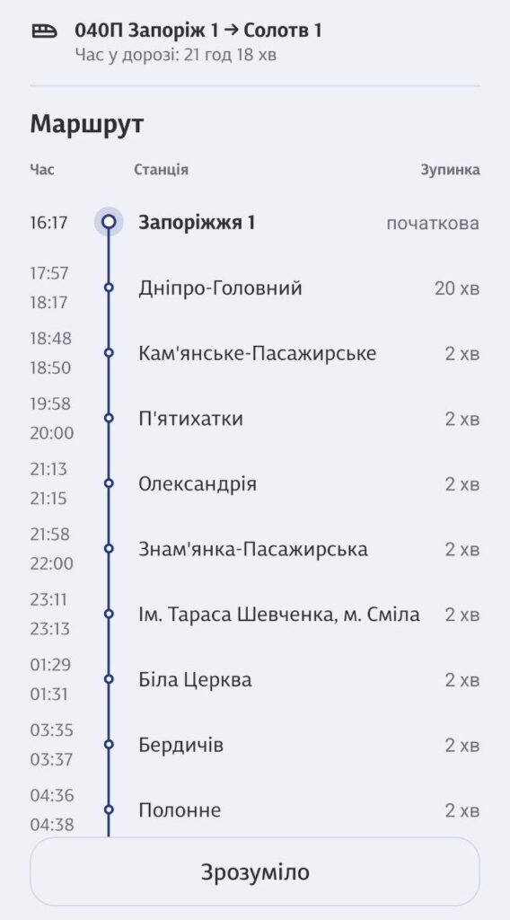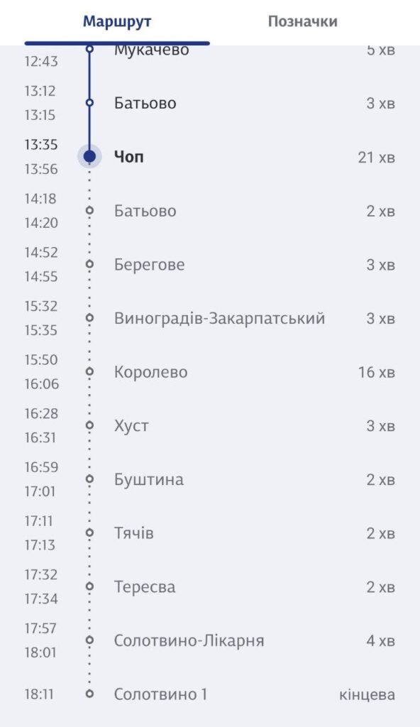 Поезд будет отправляться из Запорожья в 16:01 через день. Например, в августе 2025 года это только четные дни (2,4,6,8 и т.д.). В Днепре поезд будет в 18:17, а в Чоп будет прибывать в 13:35. Дорога из Запорожья в Чоп продлится 21 час 18 минут. Подробное расписание остановок можно посмотреть ниже.