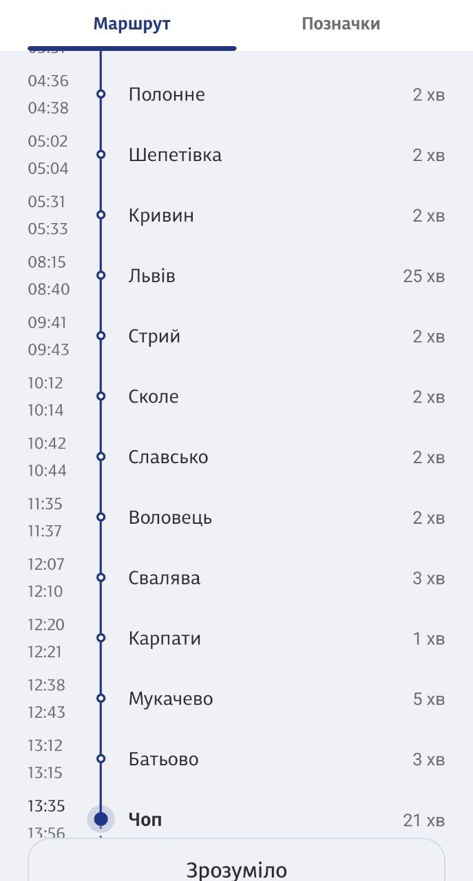 Поезд будет отправляться из Запорожья в 16:01 через день. Например, в августе 2025 года это только четные дни (2,4,6,8 и т.д.). В Днепре поезд будет в 18:17, а в Чоп будет прибывать в 13:35. Дорога из Запорожья в Чоп продлится 21 час 18 минут. Подробное расписание остановок можно посмотреть ниже.