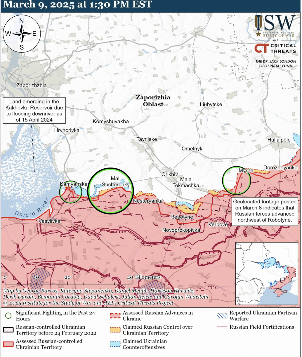 - Российские войска проводили наступательные операции к северо-западу от Роботино в районах Степного, Щербаков и Пятихаток, а также в направлении Каменского и к северо-востоку от Роботино в районе Волшебного 8 и 9 марта