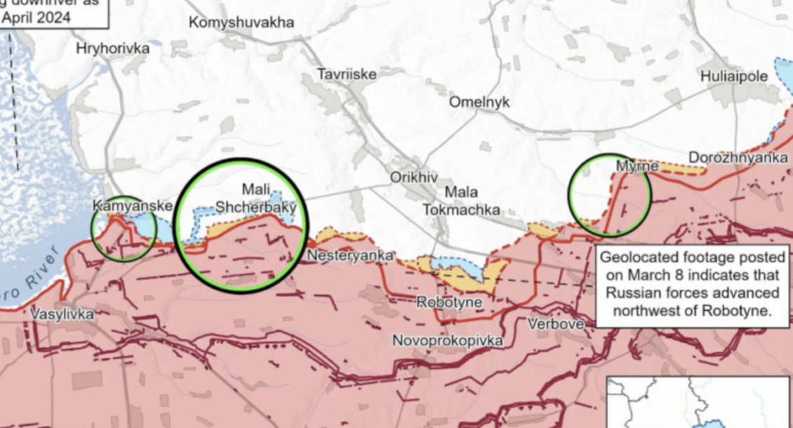 - Геолокационные данные, опубликованные 8 марта, свидетельствуют о том, что российские силы недавно продвинулись на северо-запад от Роботино