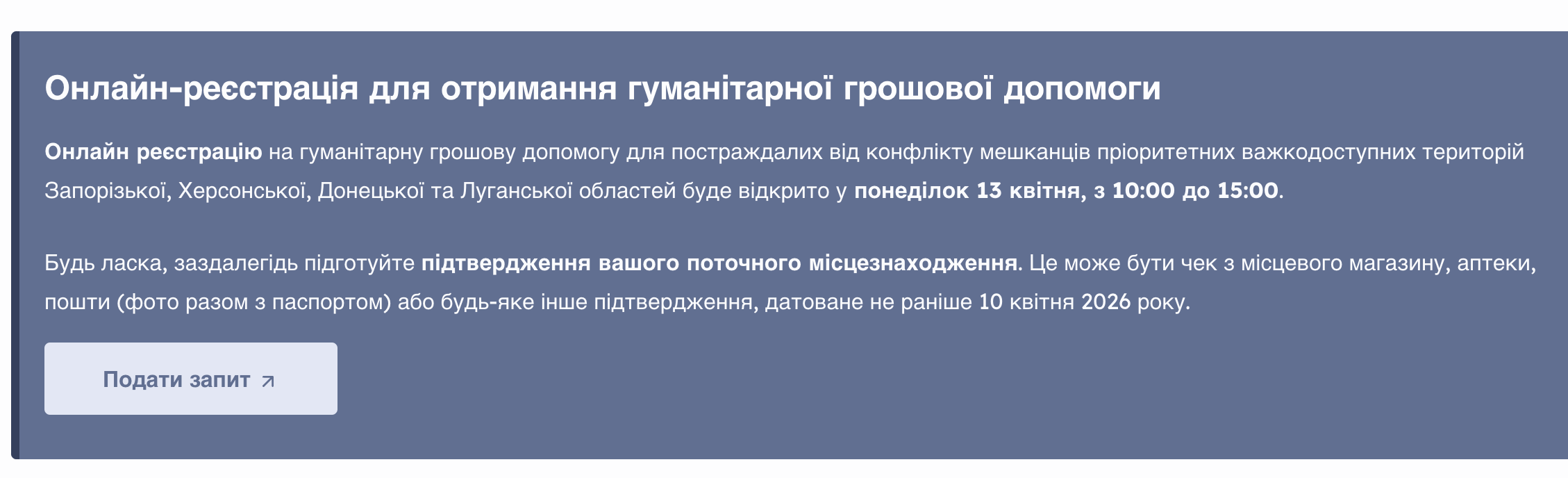 Окремо вказано, що звертатися по допомогу можуть і ті, хто протягом останніх 30 днів був змушений евакуюватися, переїхав через бойові дії або безпосередньо постраждав від обстрілів. Але такі обставини теж потрібно підтверджувати документами.