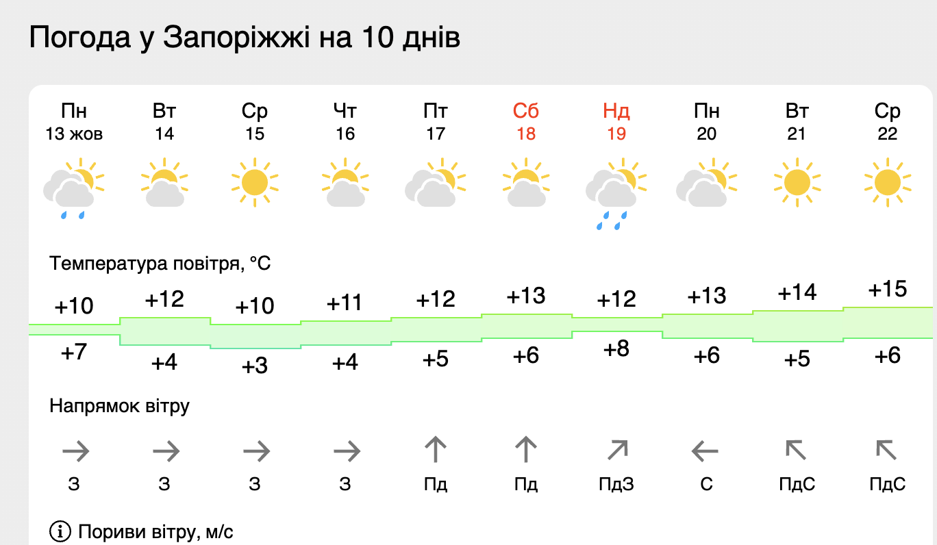 После нескольких дней прохлады и дождей в Запорожье возвращается осенняя мягкость. По данным синоптиков, уже с середины недели температура воздуха будет постепенно расти, а к следующей среде ожидается настоящее бабье лето с дневными показателями до 15 °C.