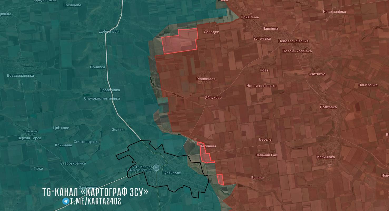 В то же время по данным украинского осинтера Картограф ВСУ, за последние дни россиянам удалось захватить около 8,7 кв км территории на Гуляйпольском направлении, в частности у Сладкого и Затишья.