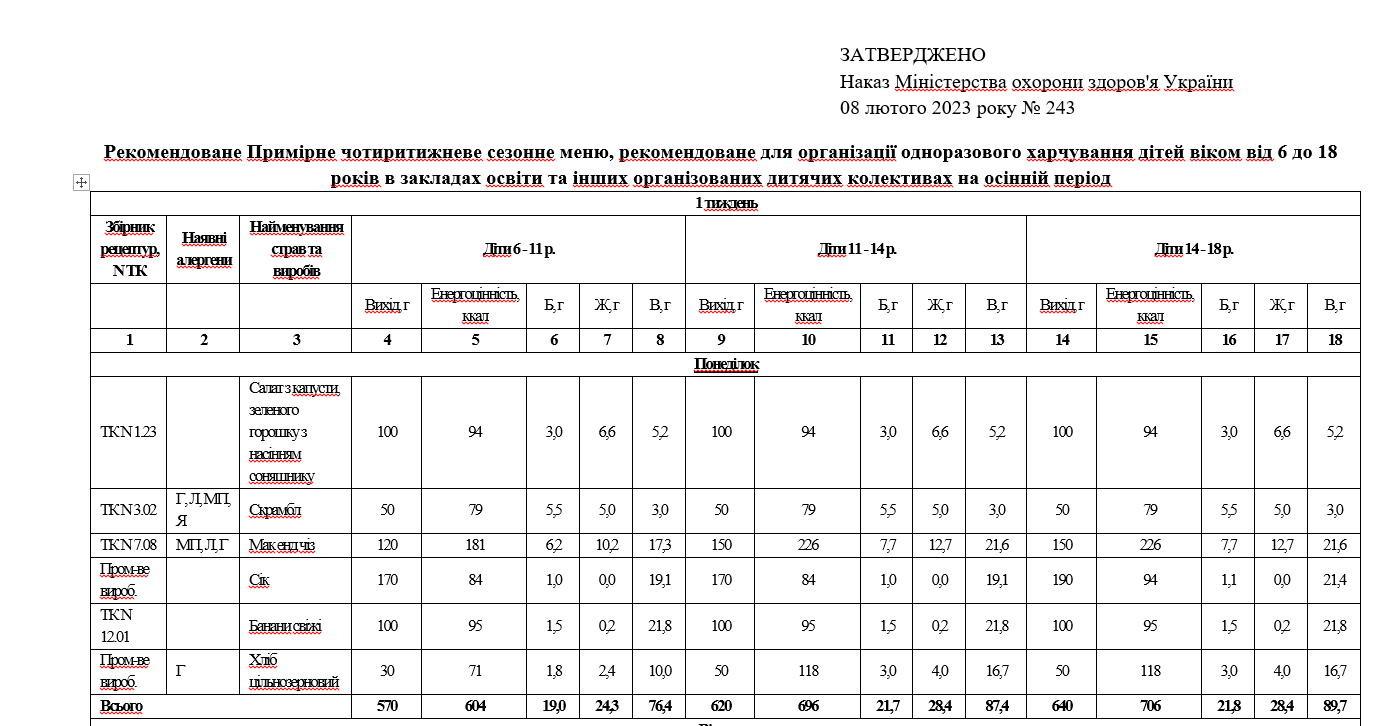 Примерное четырехнедельное сезонное меню разрешено использовать после согласования с территориальным органом Госпродпотребслужбы. Без такого согласования разрешено использовать меню, рекомендованное МОЗ Украины.