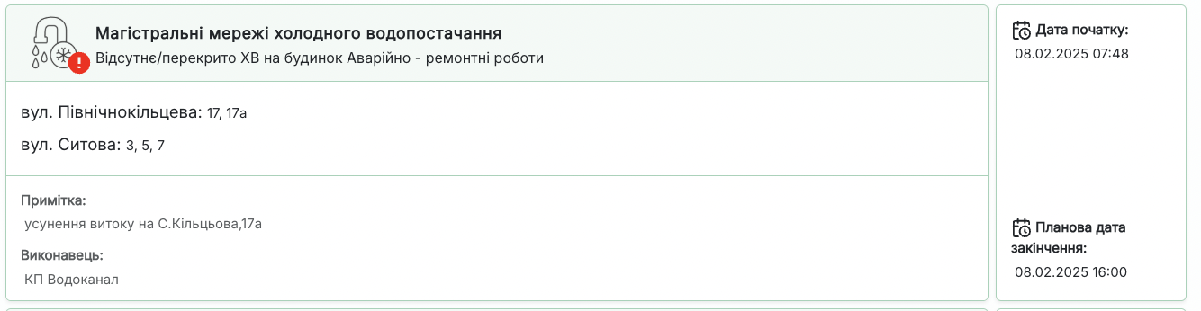 Работы выполняет коммунальное предприятие «Водоканал». Начало работ зафиксировано в 07:48, а завершить их планируется до 16:00 того же дня.