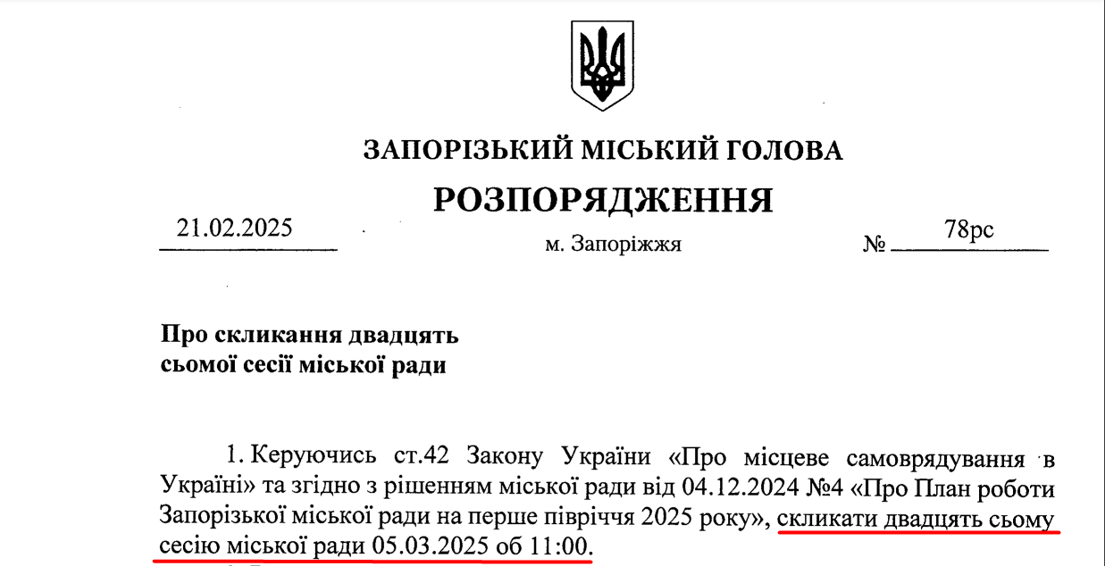 Решение о созыве сессии принято на основании ст. 42 Закона Украины «О местном самоуправлении в Украине» и согласно решению городского совета от 04.12.2024 №4 «О Плане работы Запорожского городского совета на первое полугодие 2025 года».