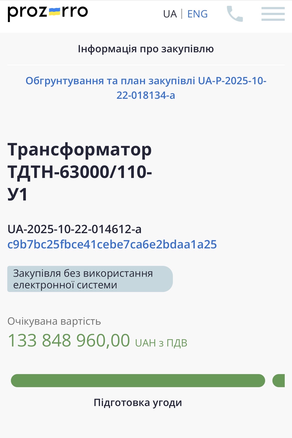 22 октября «Киевтеплоэнерго» заключило с «Запорожтрансформатором» договор на 133,85 млн грн по поставке двух силовых трансформаторов типа ТДТН-63000/110-У1. Их должны доставить в Киев до конца 2026 года.