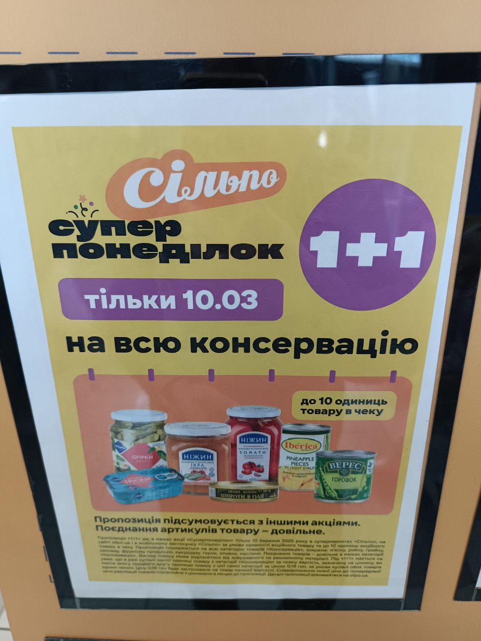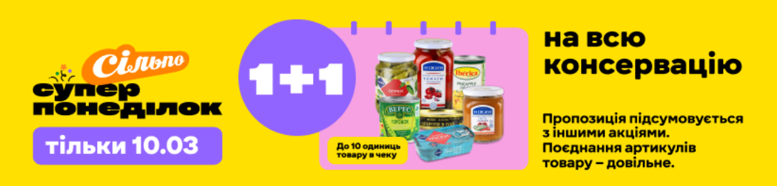 Предложение 1 1 действует в рамках акции «Суперпонедельник» только 10 марта 2025 года в супермаркетах «Сільпо», на сайте silpo.ua и в мобильном приложении «Сільпо» при условии наличия акционного товара в чеке.