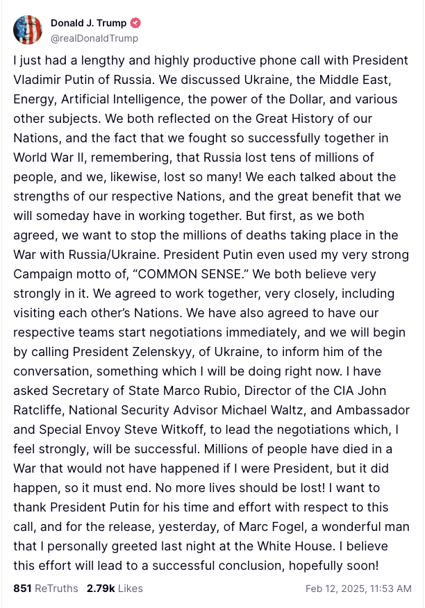 «Как мы оба согласились, мы хотим остановить миллионы смертей, которые происходят в войне с Россией/Украиной. Президент Путин даже использовал мой очень сильный девиз кампании: «ЗДРАВЫЙ СМЫСЛ». Мы оба очень верим в это. Мы договорились работать вместе, в том числе посетить страны друг друга. Мы также договорились, что наши команды немедленно начнут переговоры, и мы начнем с того, что позвоним президенту Украины Зеленскому, чтобы сообщить ему о разговоре, что я сейчас и сделаю».