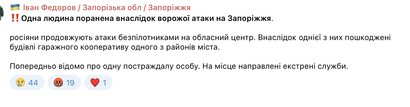 Также власти сообщают, что один человек ранен в результате вражеской атаки на Запорожье.