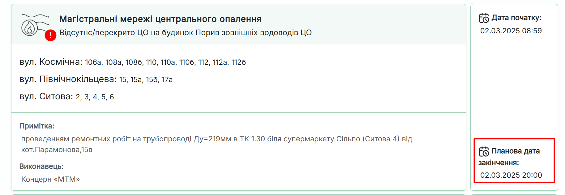 Сегодня, 2 марта, продолжается проведение ремонтных работ на трубопроводе Ду = 219мм в ТК 1.30 возле супермаркета Сильпо (ул. Сытова 4) от котельной на ул.