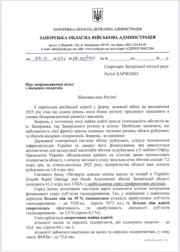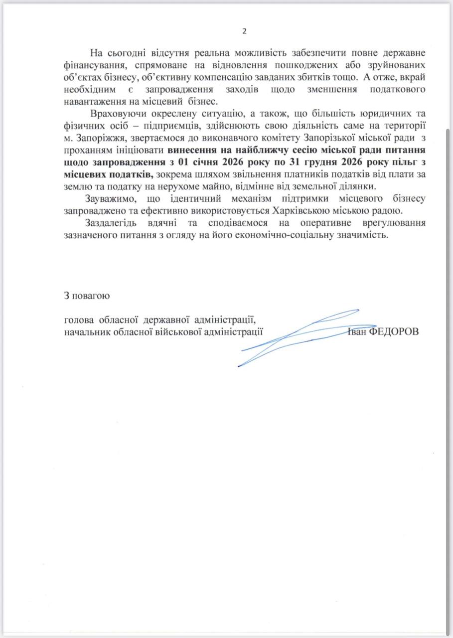 Внес представление в Запорожский городской совет — безотлагательно принять решение о введении налоговых каникул для бизнеса Запорожья с 1 января и на весь 2026 год, — сообщил Федоров.