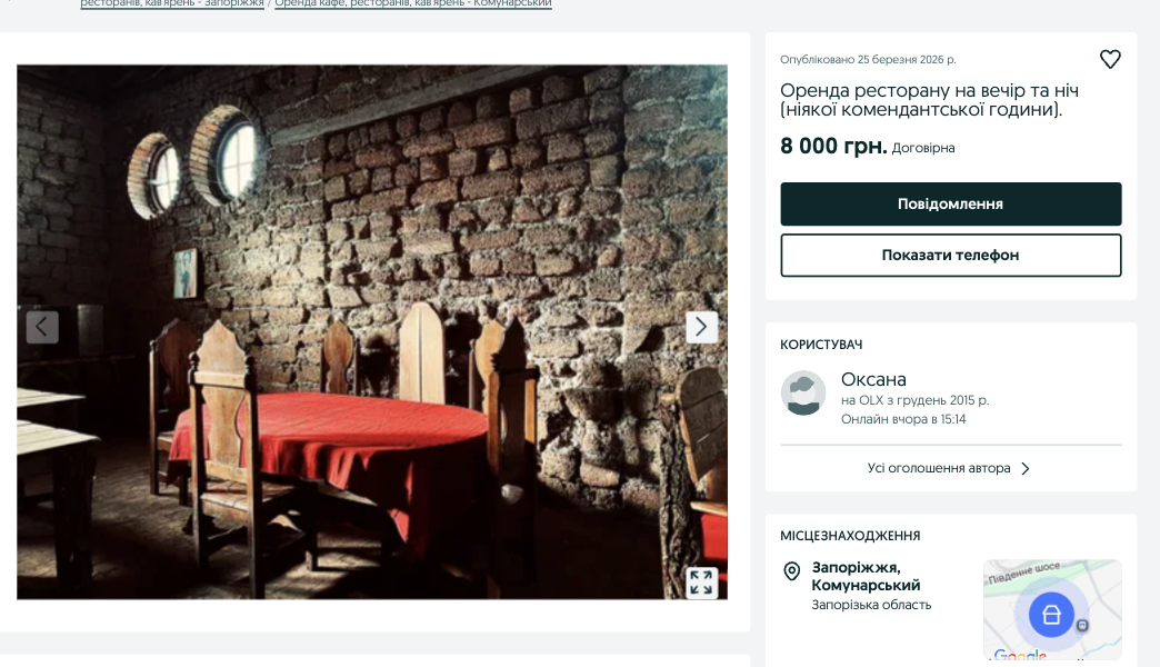 Объявление касается ресторанного помещения в Коммунарском районе. Стоимость аренды составляет 8 тысяч гривен. В тексте прямо указано, что заведение можно арендовать на вечер и ночь, и при этом подчеркивается: никакого комендантского часа.