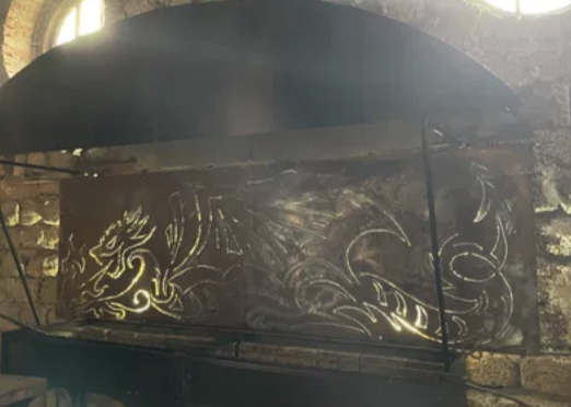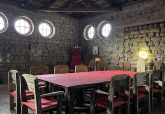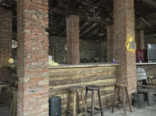 Согласно объявлению, помещение рассчитано на 300 гостей. Ресторан имеет выразительный атмосферный интерьер: каменные стены, массивная деревянная мебель и стилизация, которая больше напоминает тематический зал для нестандартных мероприятий, чем классическую банкетную площадку.