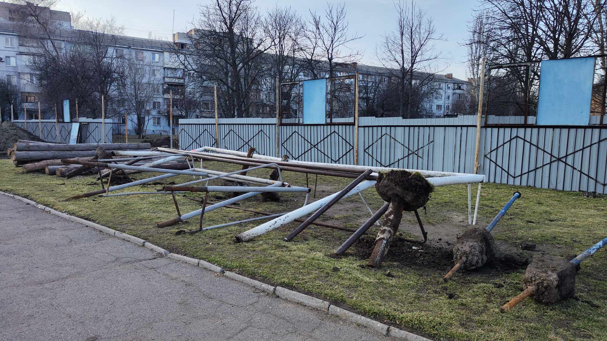 Триває демонтаж спортивних споруд, частково облаштована огорожа будівельного майданчику.