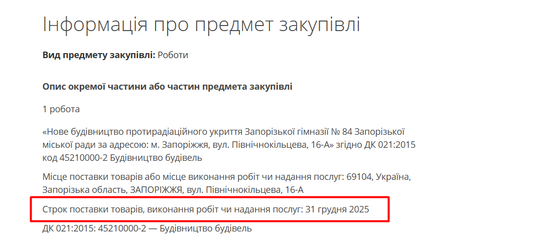 Згідно документації, протирадіаційне укриття має бути зведено до 31 грудня 2025 року.