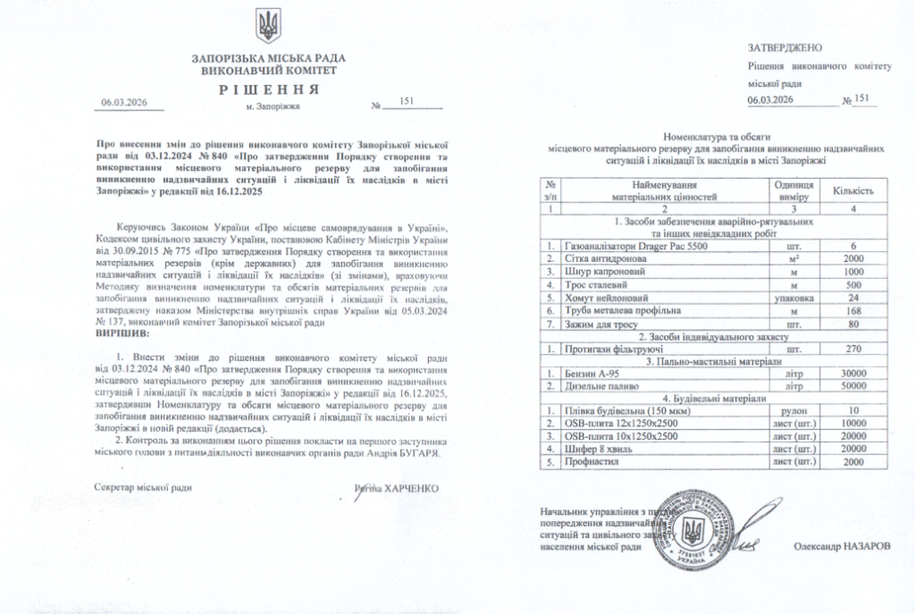 Исполнительный комитет Запорожского городского совета принял решение №151 от 6 марта 2026 года о внесении изменений в решение от 3 декабря 2024 года №840 о порядке создания и использования местного материального резерва для предотвращения чрезвычайных ситуаций и ликвидации их последствий.