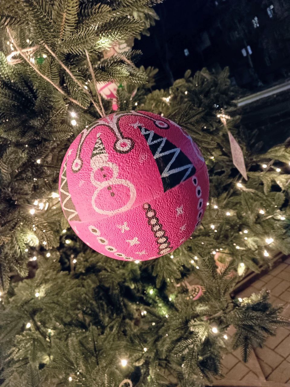 - Праздничная елка, украшенная огромными яркими шарами, разнообразными игрушками и гирляндами, которая сияет и дарит ощущение праздника
