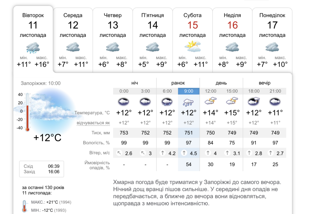 - 11 ноября (вторник) — до 16°C, кратковременные дожди.