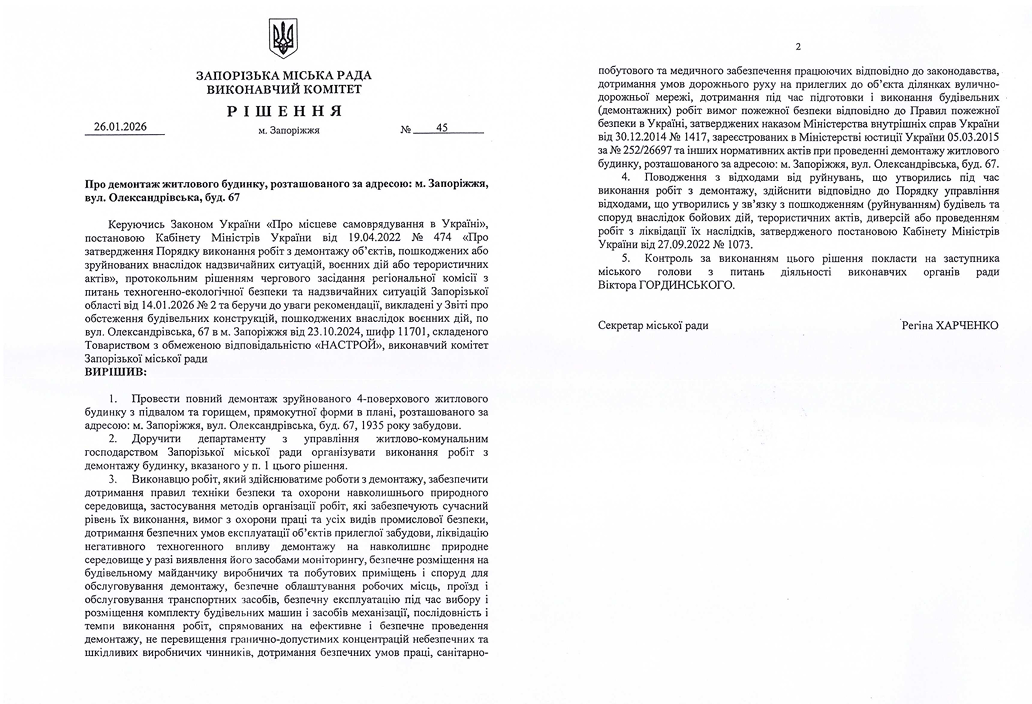 Исполнительный комитет Запорожского городского совета принял решение о полном демонтаже жилого дома, расположенного по адресу: город Запорожье, улица Александровская, дом 67.
