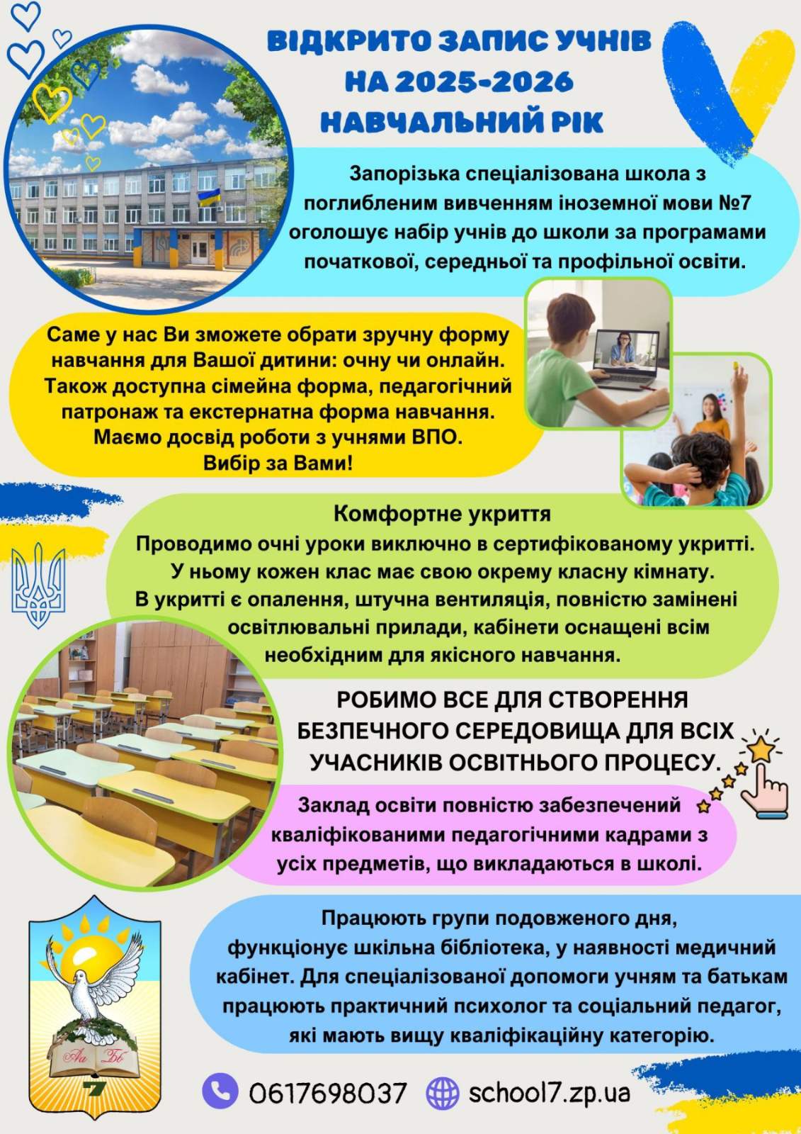 За более подробной информацией и по вопросам записи обращайтесь по телефону: 0617698037 или посетите вебсайт учебного заведения: school7.zp.ua.