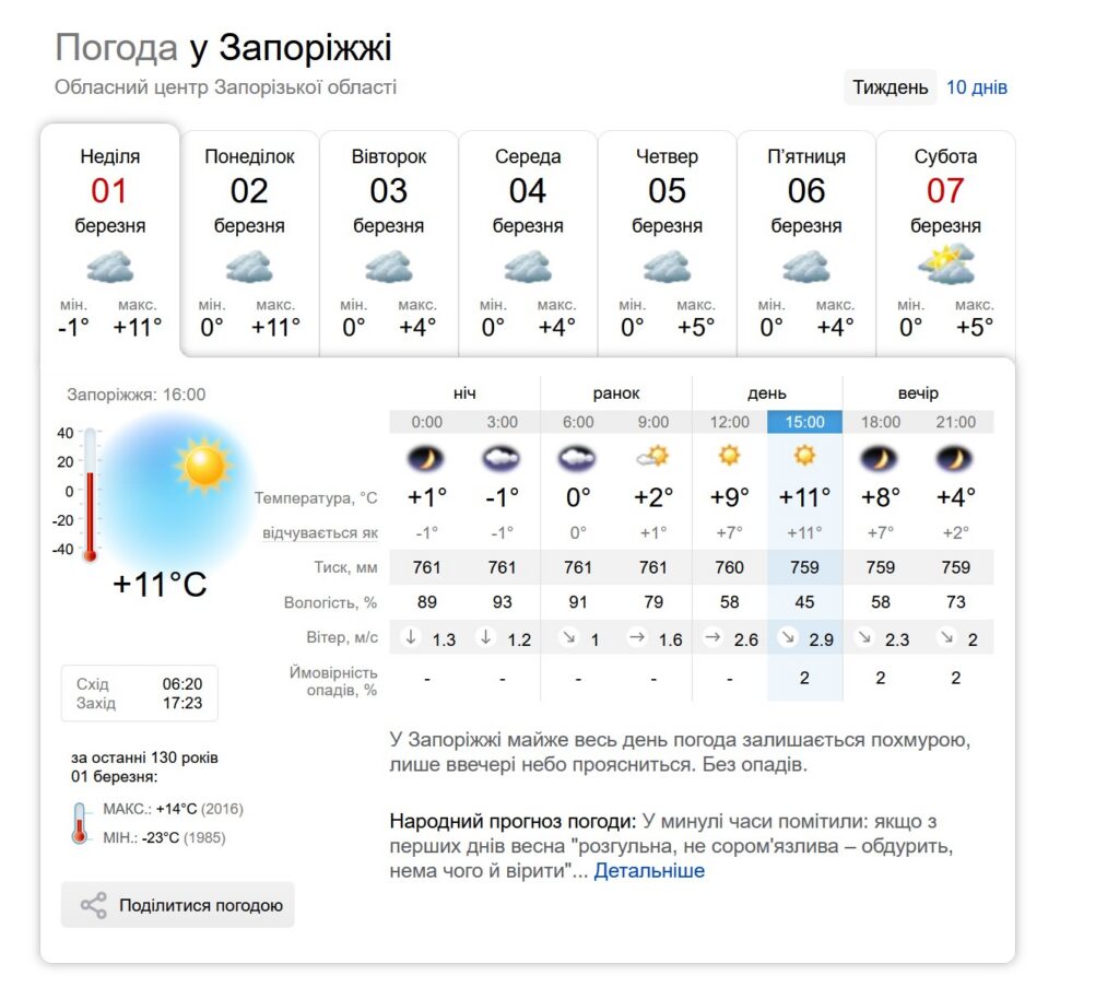 В воскресенье, 1 марта, в Запорожье ожидается потепление до 11°C. Несмотря на солнечную погоду днем, синоптики прогнозируют, что в течение недели в городе будет преобладать облачность.
