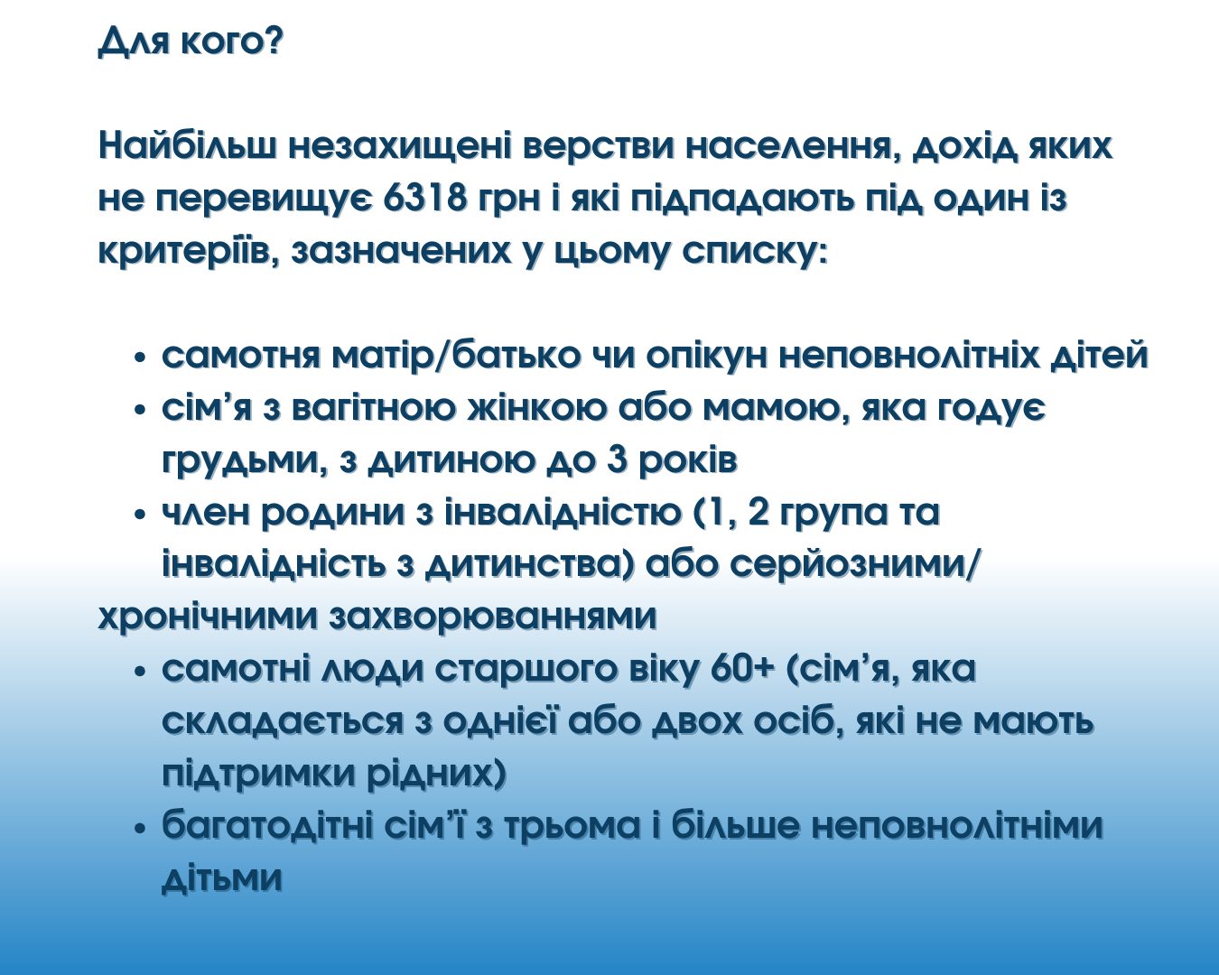 Проект предусматривает помощь наиболее незащищенным слоям населения, чей доход не превышает 6318 грн и которые подпадают под один из критериев, указанных в этом списке: