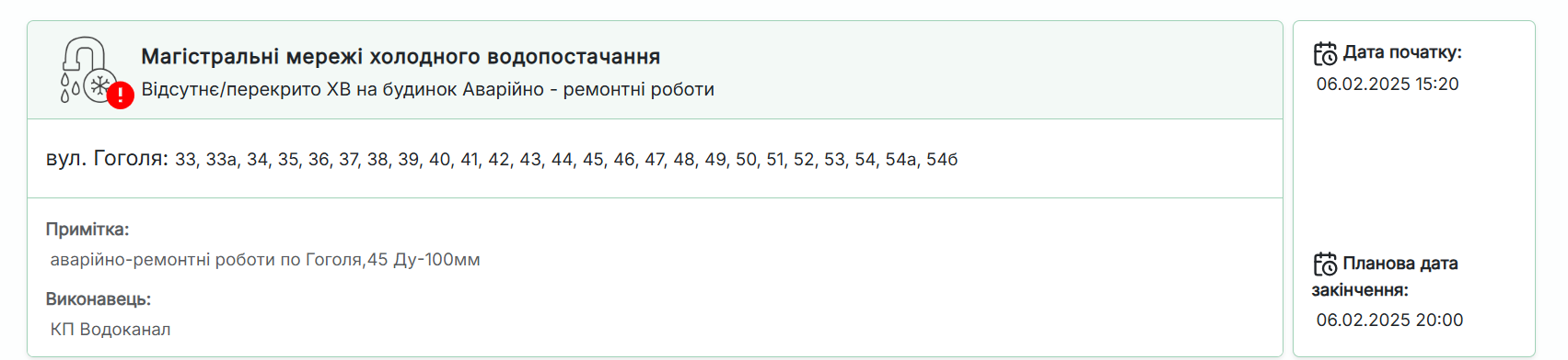 В связи с проведением аварийно-ремонтных работ на магистральных сетях холодного водоснабжения, сегодня, 6 февраля 2025 года, с 15:20 до 20:00 будет временно прекращена подача холодной воды по следующим адресам по улице Гоголя: