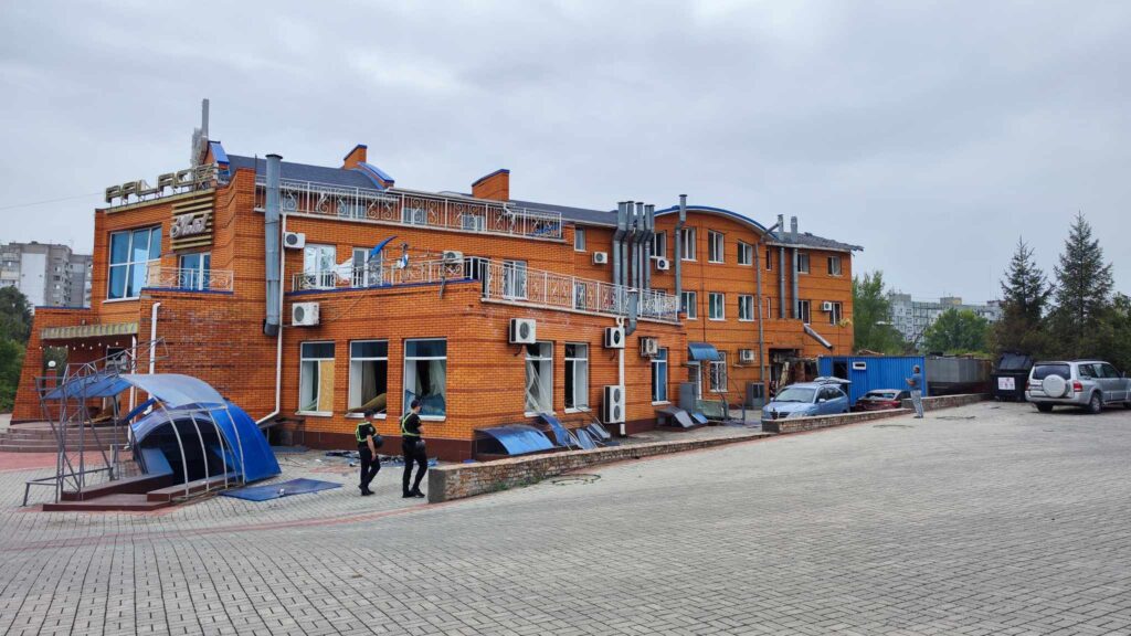 Ракета попала в задний двор отеля, где образовалась большая воронка. Взрывная волна сильно повредила здание, под обломками которого оказались пострадавшие и погибшие. Завалы всю ночь разбирали спасатели.