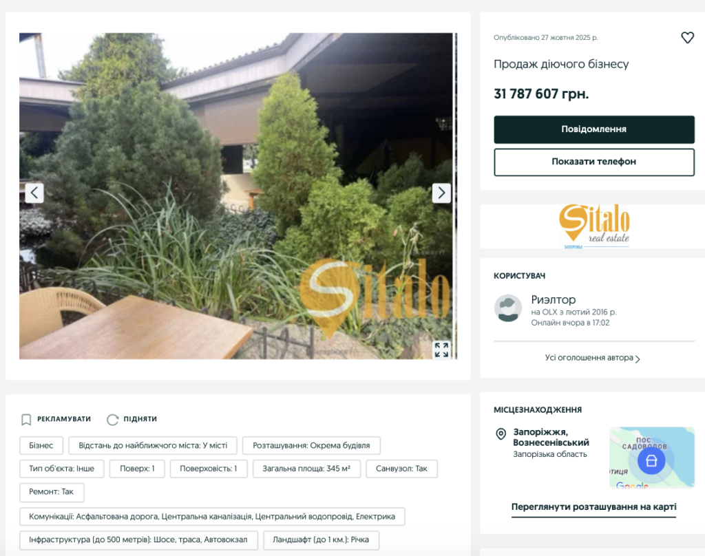 По данным агентства Sitalo Real Estate, объект имеет площадь 345 м² и расположен в отдельно стоящем здании на территории с развитой инфраструктурой — рядом трасса, автовокзал и парковка. Помещение имеет полный пакет коммуникаций: центральное водоснабжение, канализацию, электричество и асфальтированный подъезд.