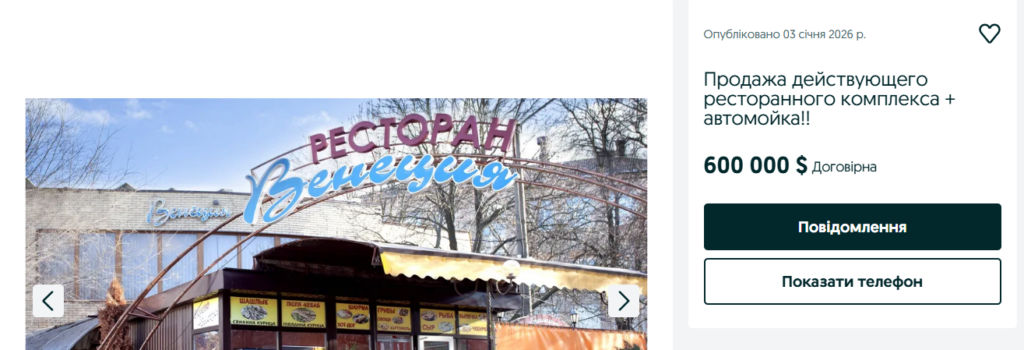 В Запорожье выставлен на продажу ресторанный комплекс «Венеция», расположенный вблизи остановки общественного транспорта «Южный рынок».