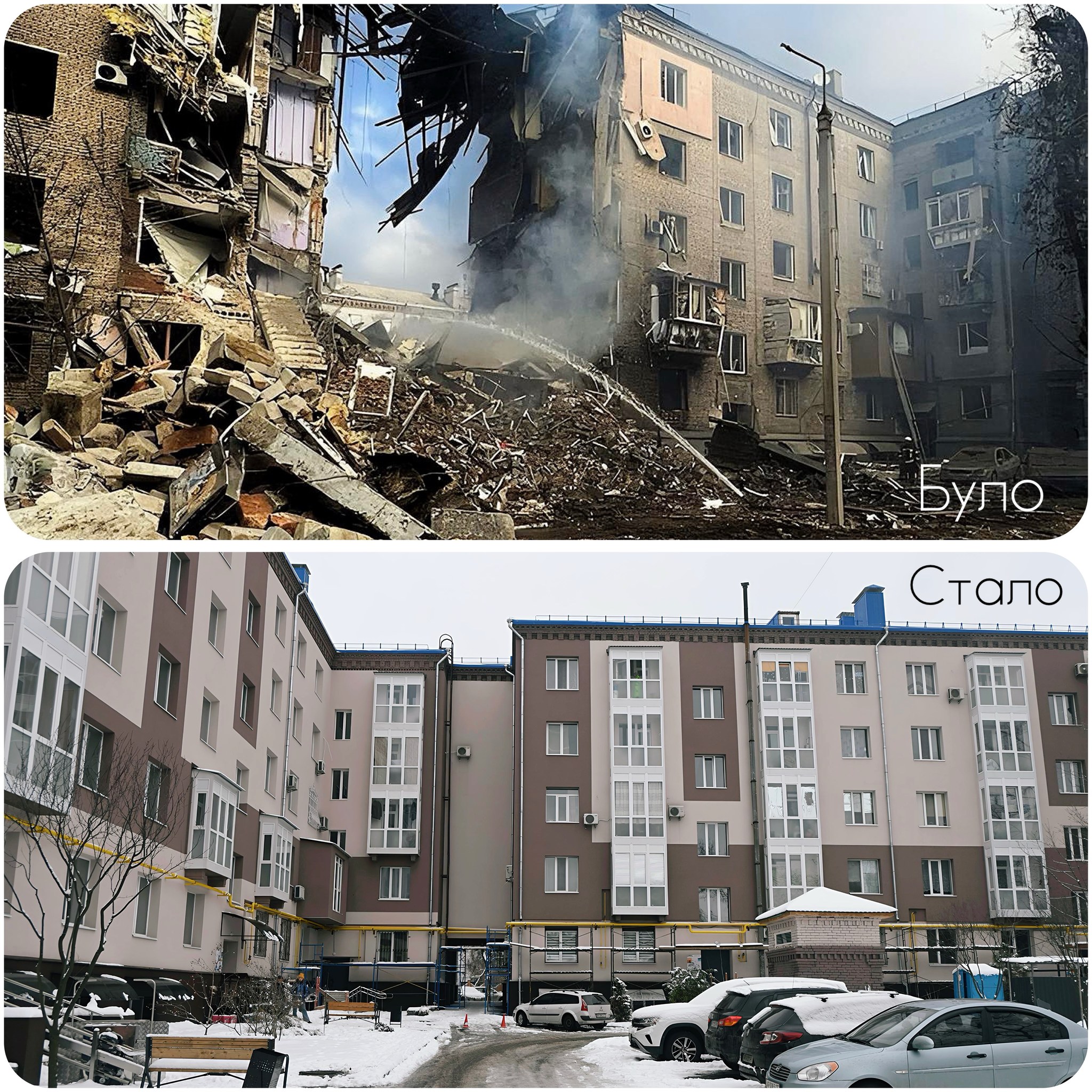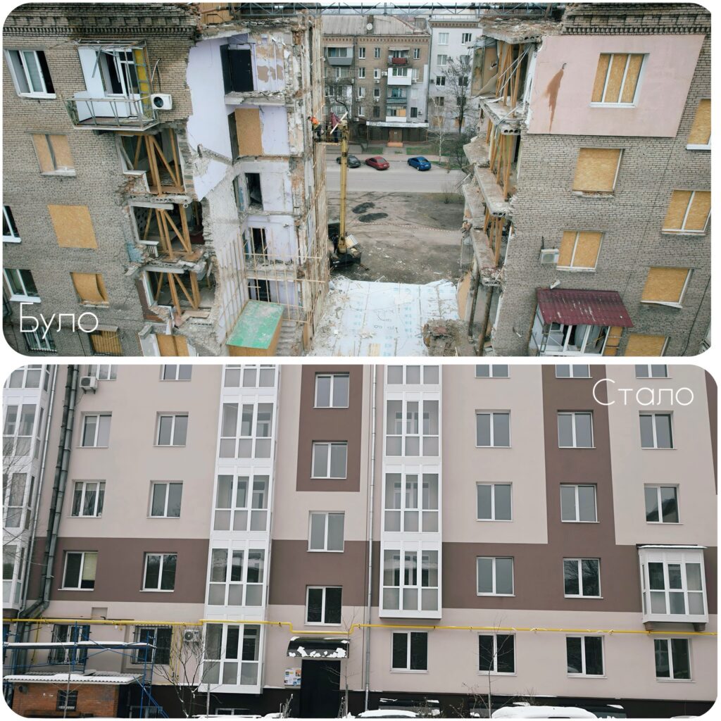 Восстановительные работы стартовали в ноябре 2023 года. Общая стоимость проекта составила около 135,5 млн грн. За это время строители восстановили разрушенные секции второго и третьего подъездов, обустроили утепленную кровлю, проложили магистральные инженерные сети водоснабжения, канализации и отопления, выполнили внутренние работы в квартирах и благоустройство придомовой территории. Все работы проводились с учетом требований инклюзивности и безбарьерности.