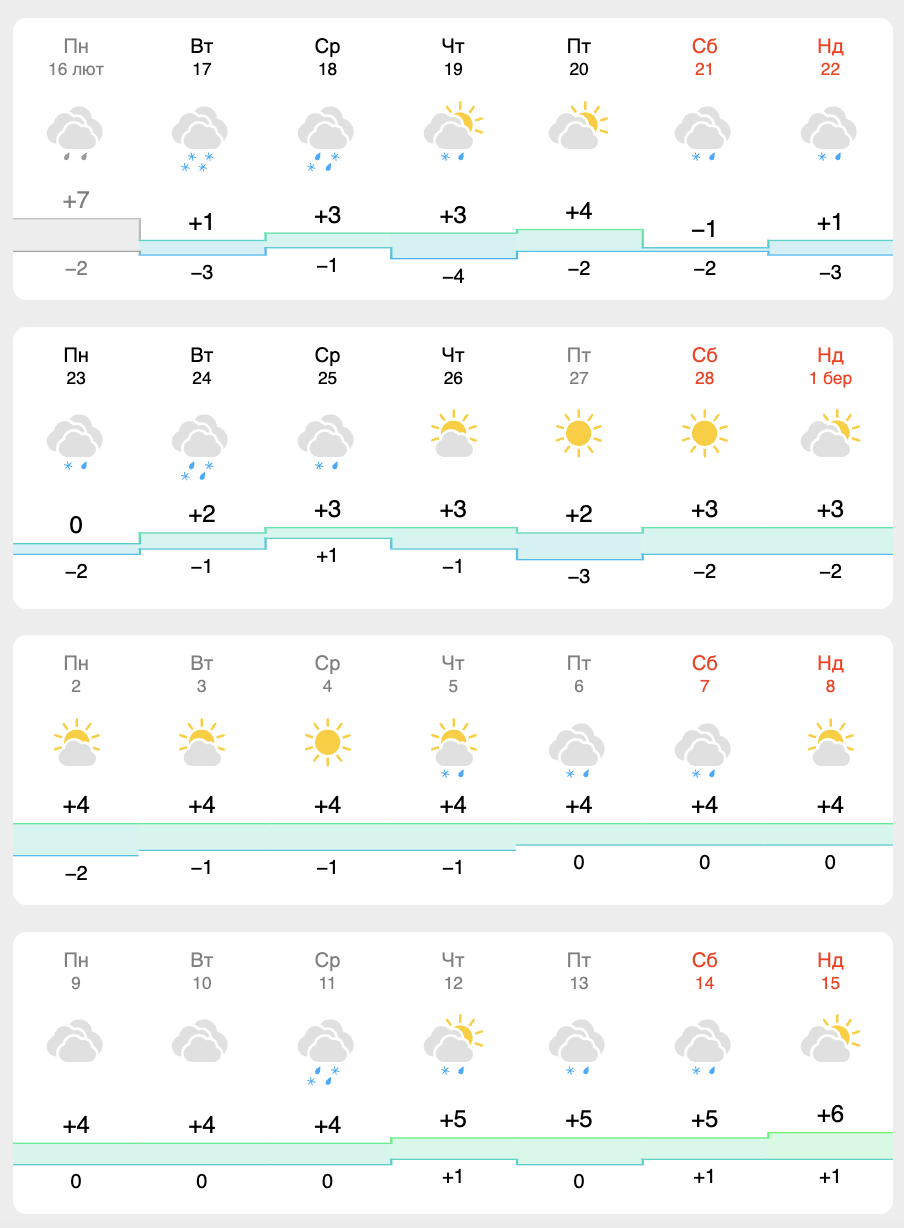 Погода в Запорожье во второй половине февраля и в начале марта будет оставаться зимней. Несмотря на календарный переход к весне, стабильного потепления пока не ожидается — температурные колебания, периодические осадки и облачность будут определять настроение месяца.